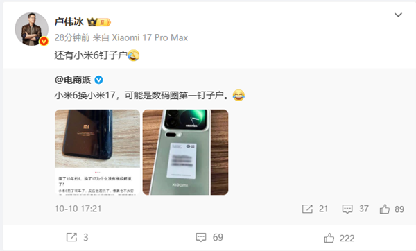 文章来源于互联网:凤凰网-小米6机主终于换小米17 卢伟冰:还有小米6钉子户