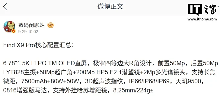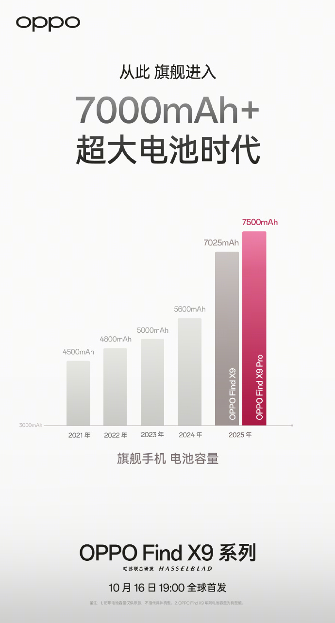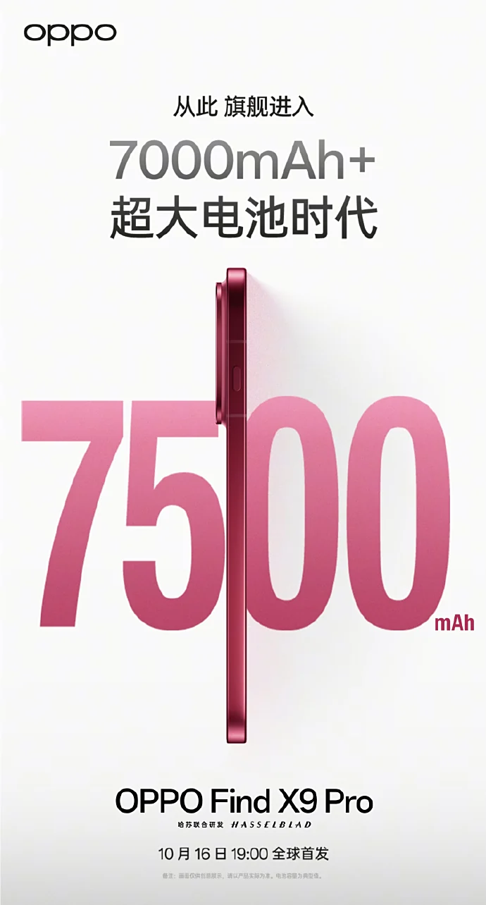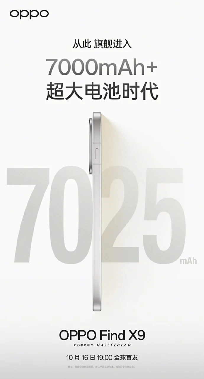 IT之家 10 月 12 日消息,OPPO 今日官宣 Find X9 系列手机搭载超 7000mAh 电池,其中标准版 7025mAh,Pro 版 7500mAh,10 月 16 日 19:00 见。