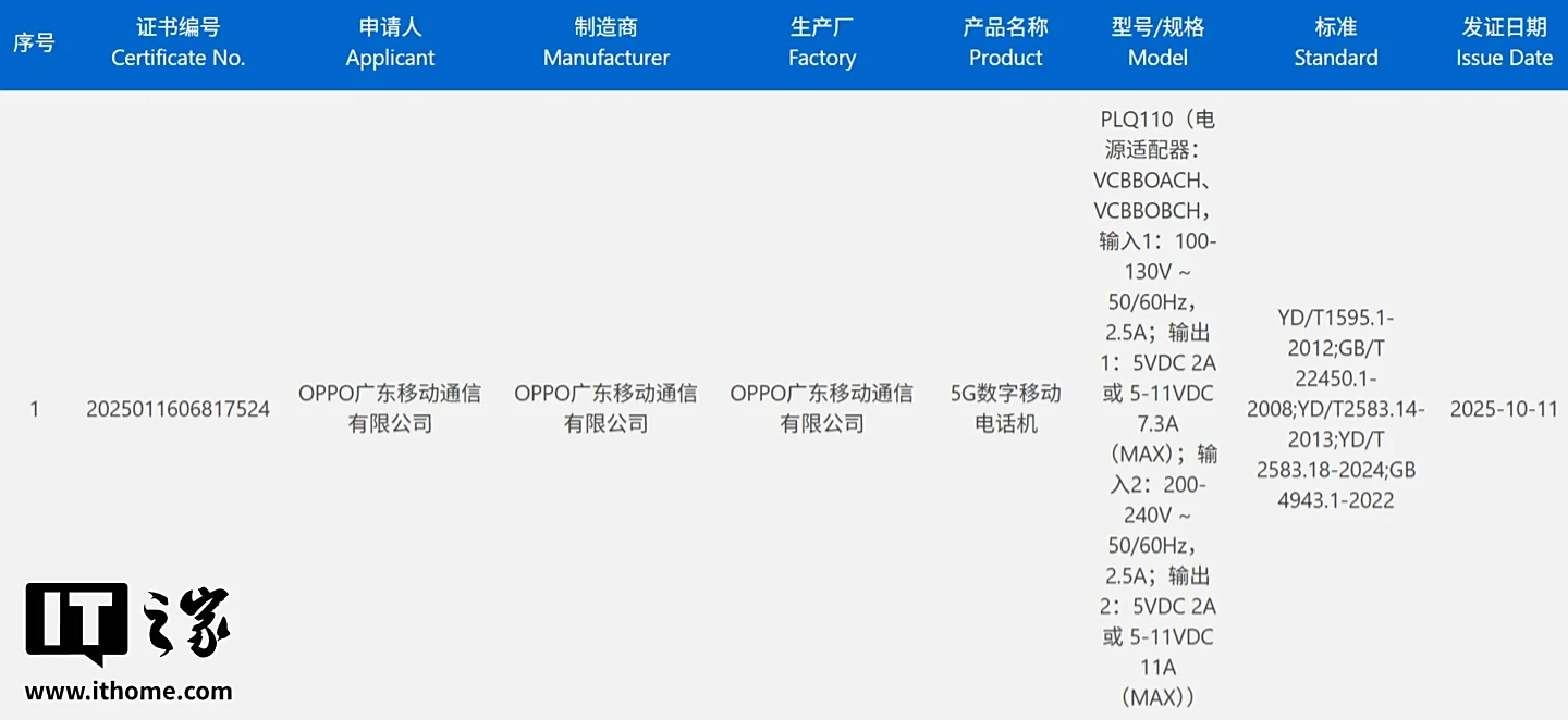 IT之家 10 月 12 日消息,一款型号为 PLQ110 的 OPPO 手机昨日通过了 3C 认证,支持 120W 超级快充。预计为一加 Ace6 手机,自此该机已经三证齐全,只待发布。