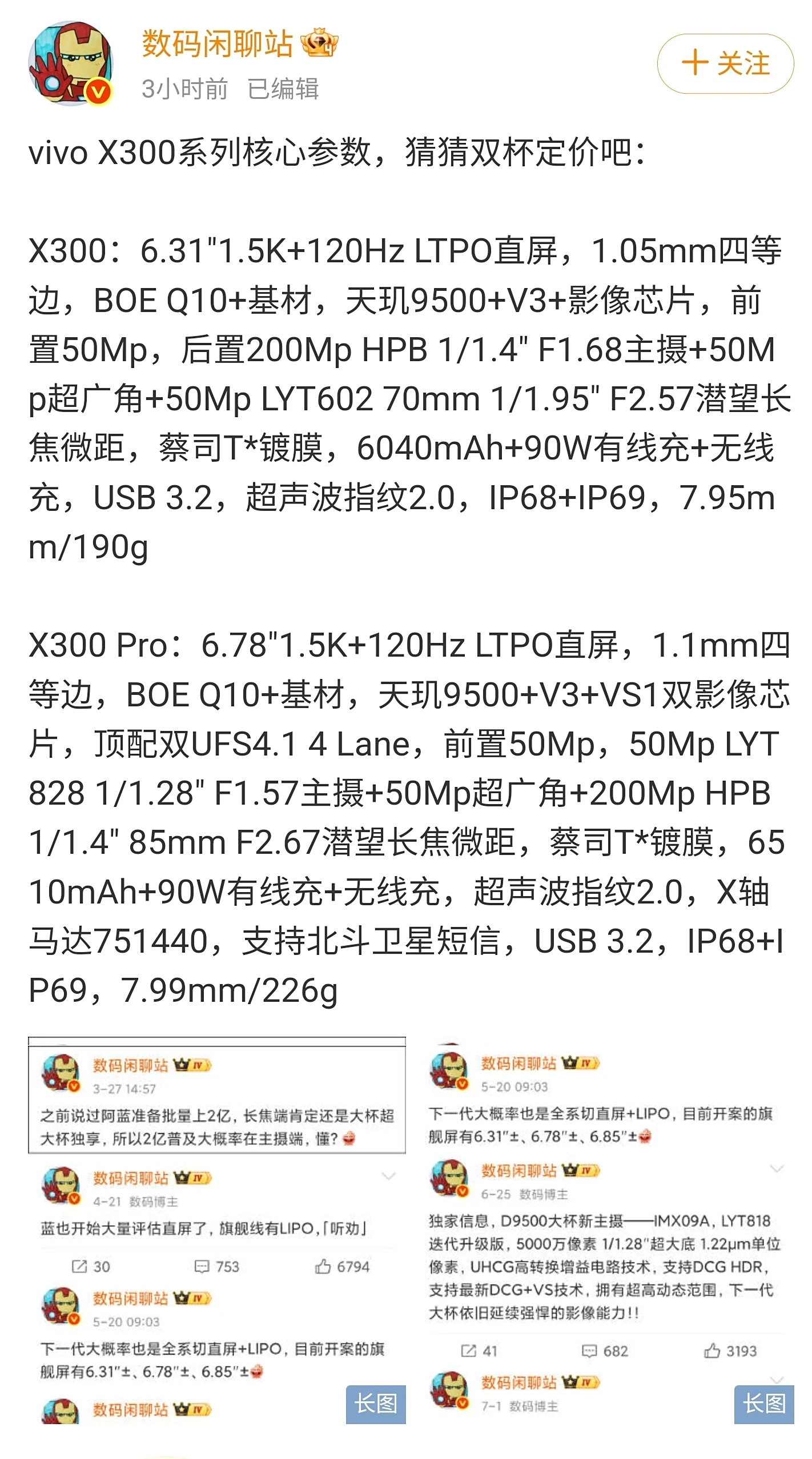 IT之家 10 月 12 日消息,vivo X300 系列新品发布会将于 10 月 13 日 19:00 在上海体育馆举行,首发天玑 9500 处理器,博主 @数码闲聊站 今日将两款新机的参数进行了汇总。