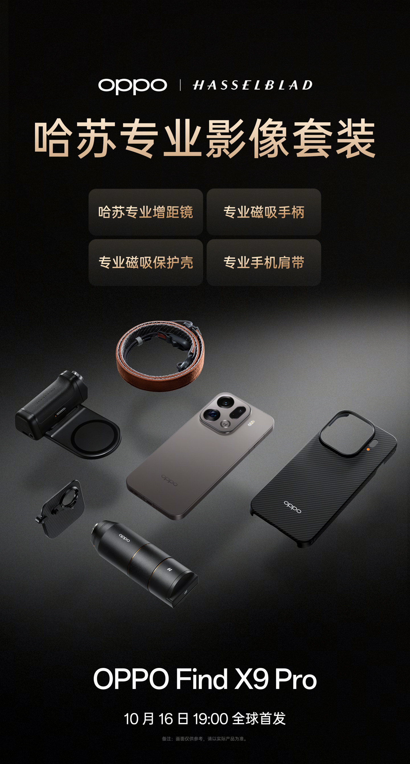 IT之家 10 月 13 日消息,今天上午,OPPO 官宣了全新的 OPPO 哈苏专业影像套装,包含哈苏专业增距镜、全新磁吸手柄、磁吸保护壳、专业手机肩带,号称“口袋中的完全体哈苏”“追星不用背相机”,将于 10 月 16 日与 OPPO Find X9 系列手机一同发布。