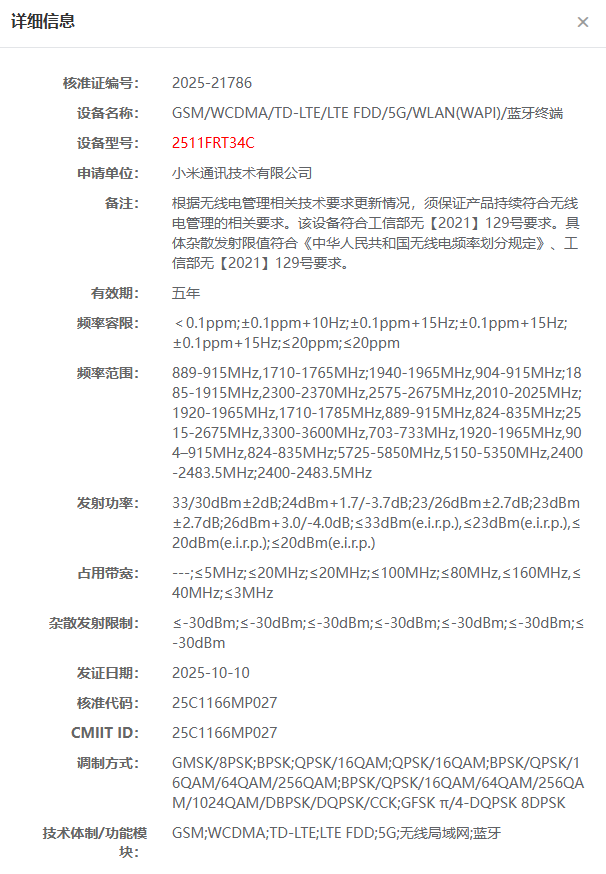 IT之家 10 月 12 日消息,一款型号为 2511FRT34C 的小米新机于 10 月 10 日通过了工信部无线电核准,预计为 REDMI Turbo 5。