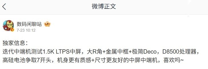 IT之家注意到,博主 @数码闲聊站 今年 7 月曾爆料一款新机测试 1.5K LTPS 中屏,大 R 角 + 金属中框 + 极简 Deco,天玑 8500 处理器,高硅电池争取 7 开头,机身更有质感 + 尺寸更友好的中屏中端机。当时被认为是小米 REDMI Turbo 5。