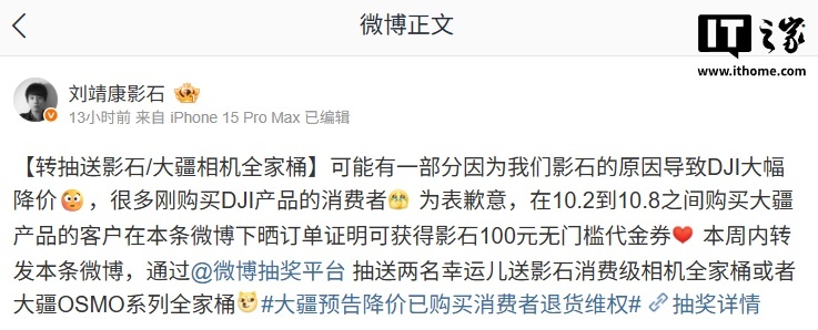 IT之家 10 月 13 日消息,影石 CEO 刘靖康今天凌晨发文称:“可能有一部分因为我们影石的原因导致 DJI(大疆)大幅降价,很多刚购买 DJI 产品的消费者为表歉意,在 10 月 2 日到 10 月 8 日之间购买大疆产品的客户在本条微博下晒订单证明可获得影石 100 元无门槛代金券。”