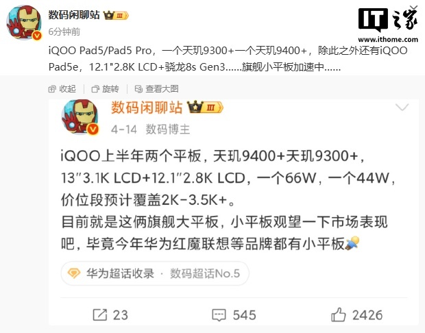 据博主 @数码闲聊站 此前预热,iQOO Pad5e 平板预计将搭载 12.1 英寸 2.8K LCD 屏幕,配备高通骁龙 8s Gen3 处理器,同时根据官方预热,这款平板将内置 10000mAh 大电池。
