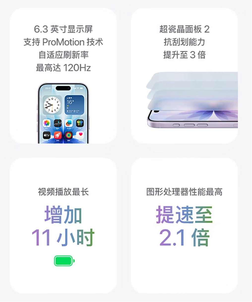 屏幕方面,iPhone 17 标准版配备更大的 6.3 英寸屏幕,苹果进一步收窄边框,并支持 ProMotion,最高刷新率为 120Hz,且最低可以到 1Hz。