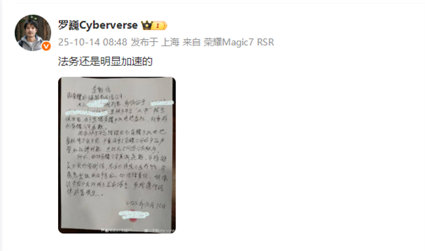 快科技10月14日消息,今日,荣耀首席影像工程师罗巍Cyberverse在社交平台晒出一网友的手写道歉信。