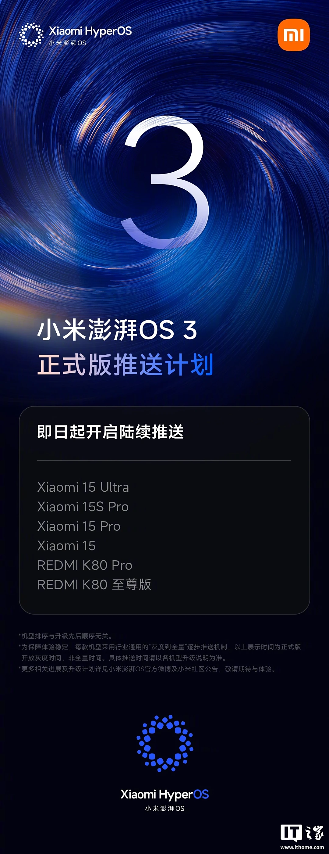 IT之家附小米澎湃 OS 3 正式版推送计划如下: