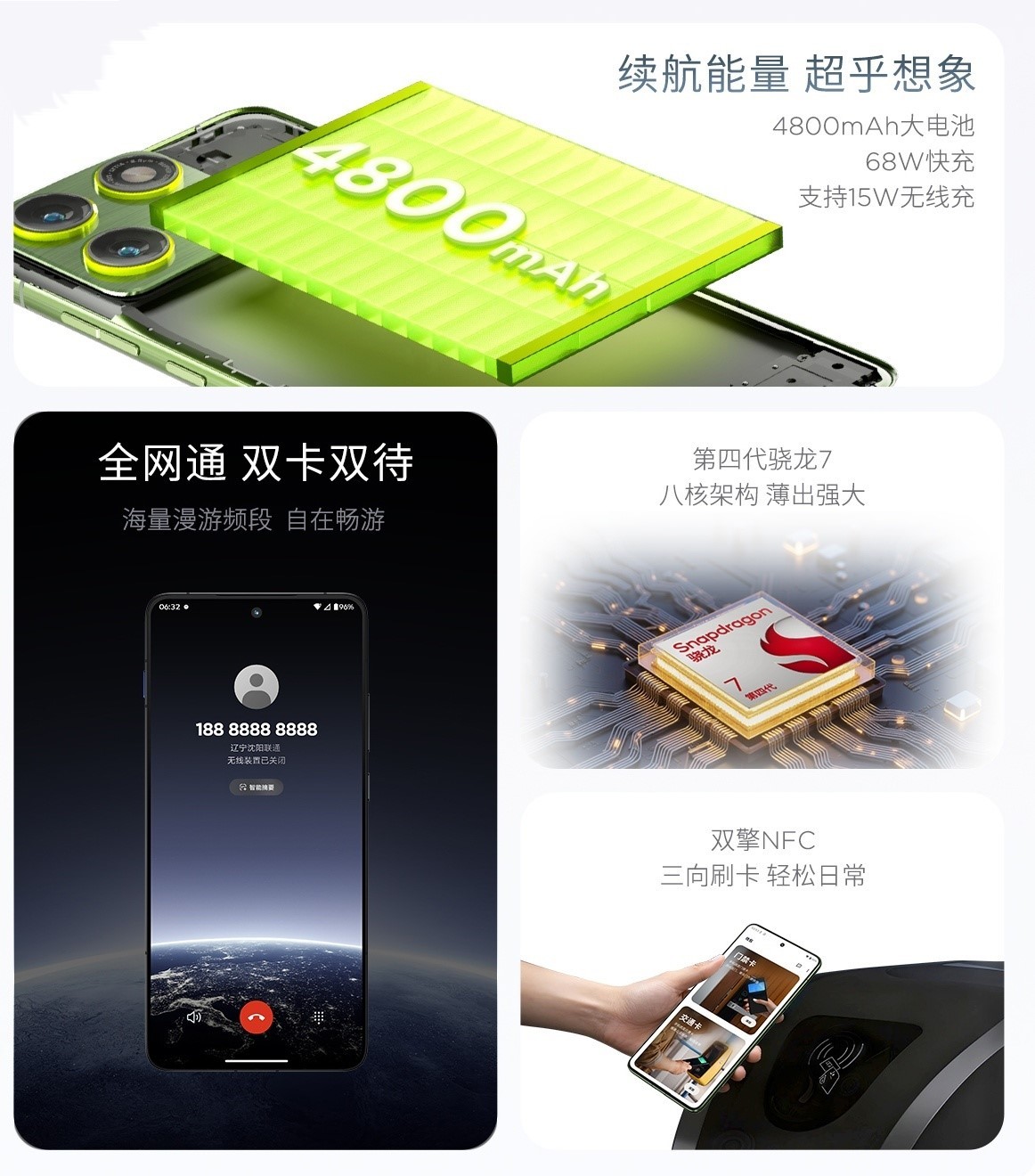 硬件方面,这款手机配备 4800mAh 大电池,搭配 68W 有线快充 + 15W 无线充电,搭载第四代高通骁龙 7 处理器,采用八核架构,机身内置双擎 NFC,支持三向刷卡,还配有全网通双卡双待,号称支持“海量漫游频段”。