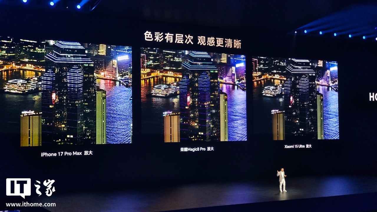 IT之家 10 月 15 日消息,在今晚的荣耀 Magic8 系列暨MagicOS 10 发布会上,荣耀终端股份有限公司 CEO 李健介绍了 Magic8 Pro 手机上的超夜神长焦,并直接与 iPhone 17 Pro Max 和 Xiaomi 15 Ultra 进行了拍摄对比。