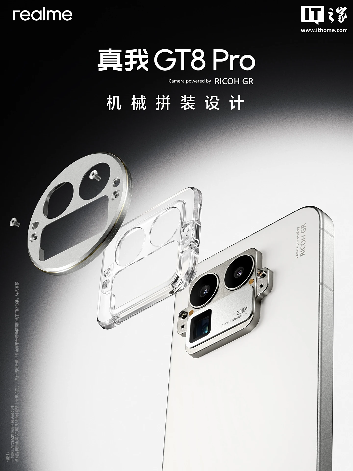 IT之家 10 月 16 日消息,realme 真我 GT8 Pro 手机今日公布了外观设计,行业首创机械拼装设计,可拆、可拼、可换。