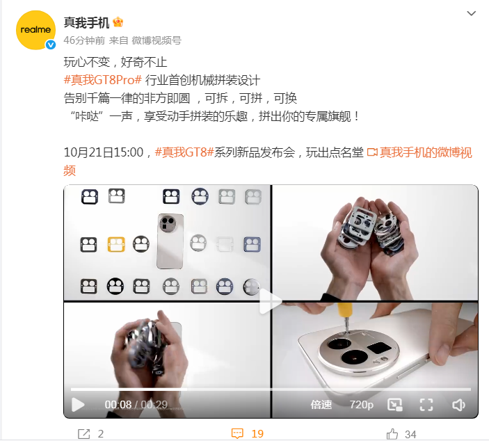 凤凰网科技讯 10月16日,真我官方发布视频,介绍新机GT8 Pro可以将不同样式的摄像头模组进行机械拼装,打造成个人的专属旗舰。官方称“告别千篇一律的非方即圆 ,可拆,可拼,可换”。