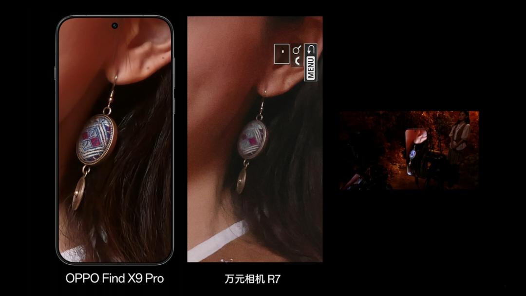 为了增强说服力,OPPO在发布会现场将Find X9 Pro与一台市面上主流的万元级微单相机做了实测对比。在同样的夜景环境下,粗略看两台机器的表现都还不错,但放大之后会看到明显的差异,Find X9 Pro对人像的处理会更加细腻,而且模特的耳饰更清晰,还原了金属的光泽,成片素质甚至可以媲美目前影像行业最顶级的中画幅相机。