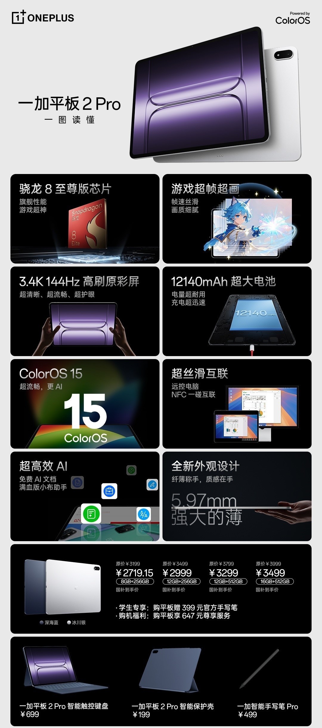 作为参考,一加平板 2 Pro 于今年 5 月发布,配备 13.2 英寸 3.4K 144Hz 高刷 LCD 原彩屏(3392*2400)、骁龙 8 至尊版芯片、ColorOS 15,售价 3199 元起。