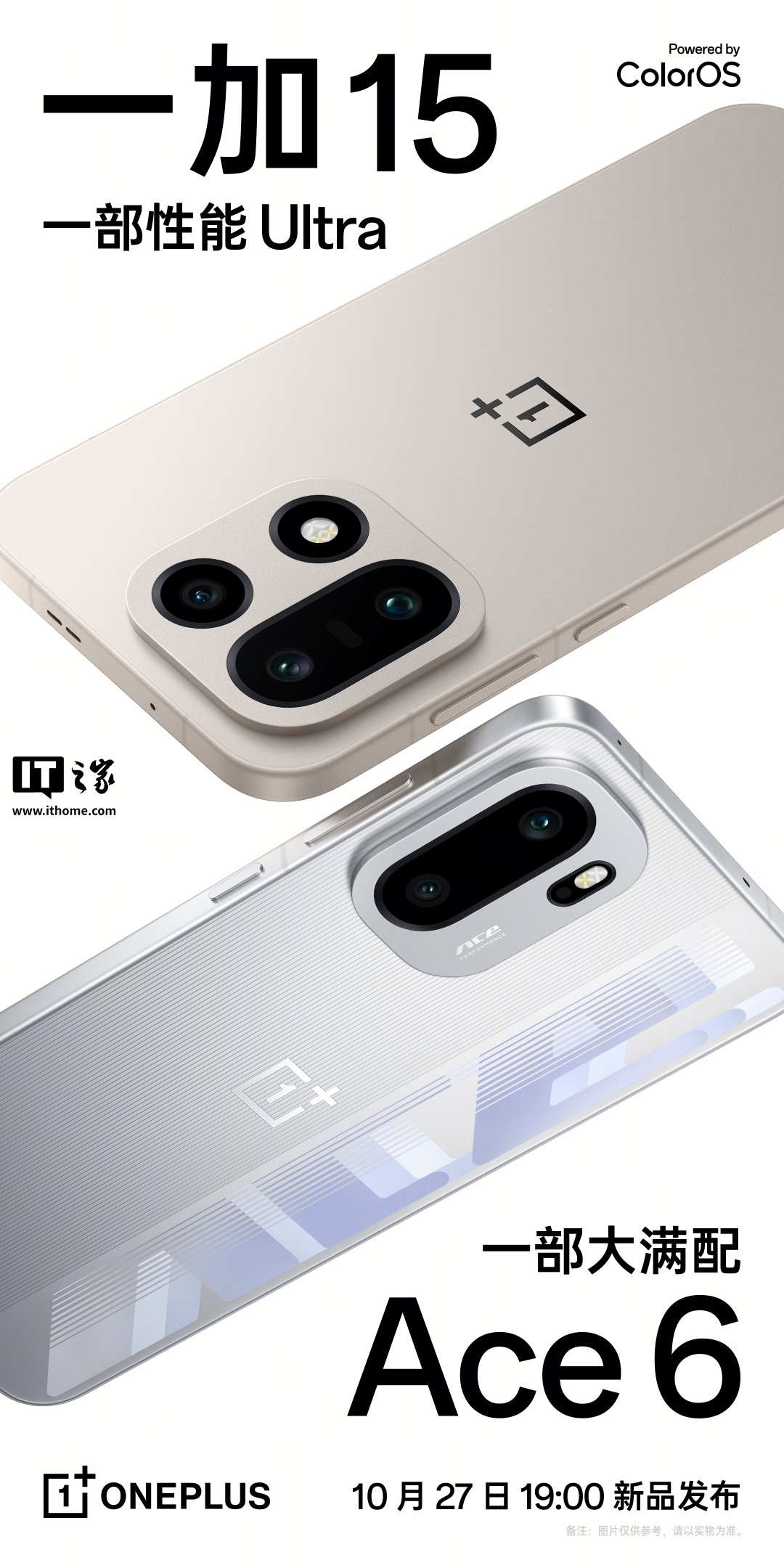 此外,一加 15 / Ace6 已官宣“双舰齐发”,新机将于 10 月 27 日 19:00 发布,三款配色现已公布:原色沙丘、绝对黑、雾光紫,其中绝对黑行业首发「全哑丝绸玻璃」,3.7% 超低反射率;雾光紫行业首发「双维流光玻璃」,注入光敏材料,色彩随光而变。