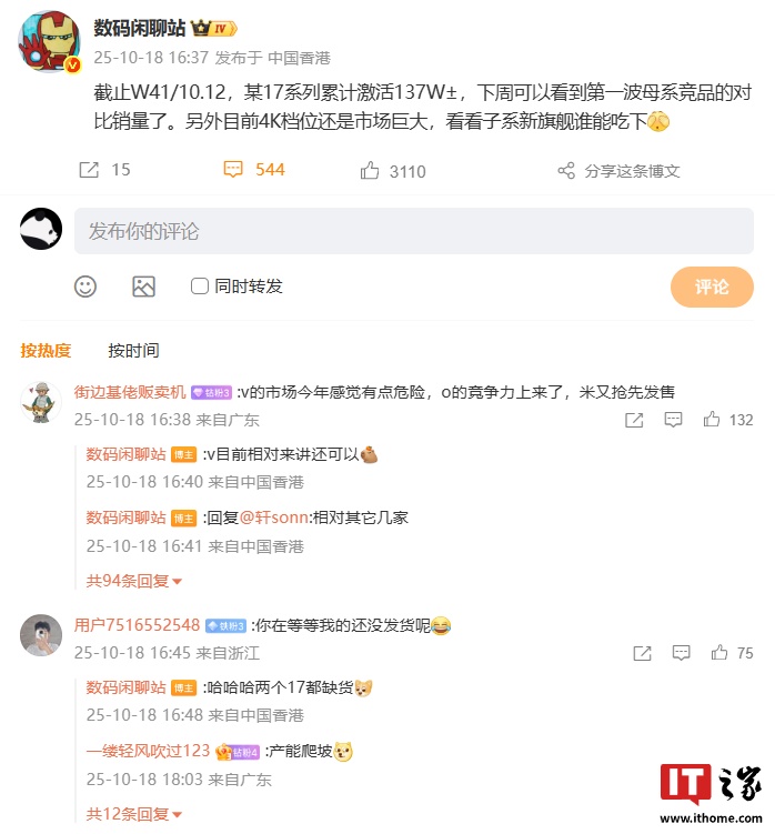 IT之家 10 月 18 日消息,博主 @数码闲聊站 今日发文透露,截止 10 月 12 日,某 17 系列(结合评论区讨论来看,预计是小米 17 系列)累计激活 137 万左右,下周可以看到第一波母系竞品的对比销量。博主表示,另外目前 4K 档位市场巨大,看看子系新旗舰谁能吃下。