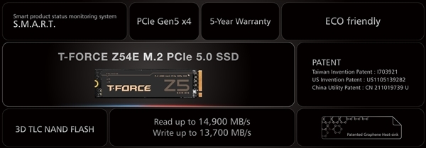 T-FORCE Z54E采用标准的M.2 2280,TLC闪存,容量1TB、2TB、4TB,顺序读写速度达到了14.9GB/s、14GB/s(1TB写入为13.7GB/s),已经吃满了PCIe 5.0 x4的理论带宽,不过随机指标未公开。