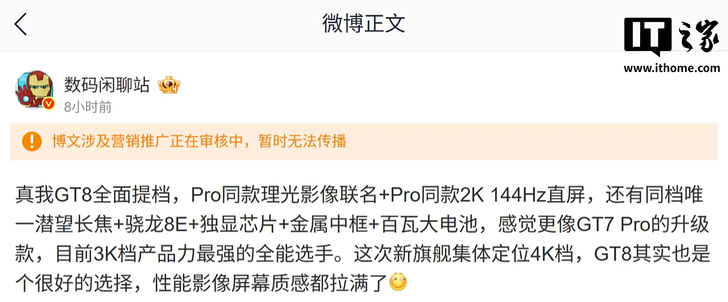 博主表示,真我 GT8 手机是目前 3000 元档产品力最强的全能选手(暗示新机定位 3000 元阶段),这次新旗舰集体定位 4K 档,GT8 其实也是个很好的选择,性能影像屏幕质感都拉满了。