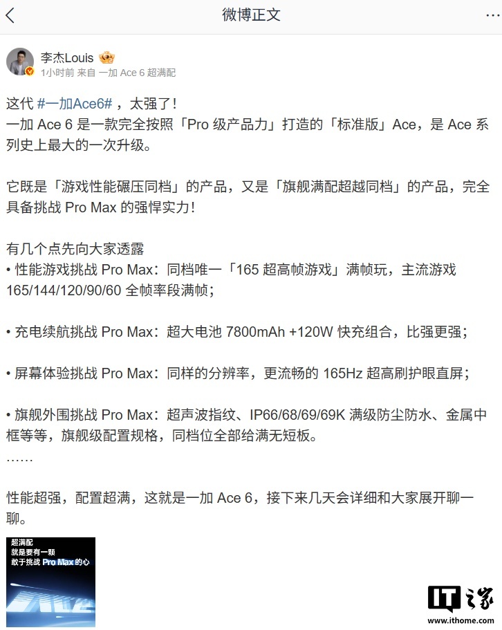 IT之家 10 月 20 日消息,一加中国区总裁 @李杰Louis 今日公布了一加 Ace 6 的部分规格,号称“Ace 系列史上最大的一次升级”,这款新机将于 10 月 27 日 19:00 发布。