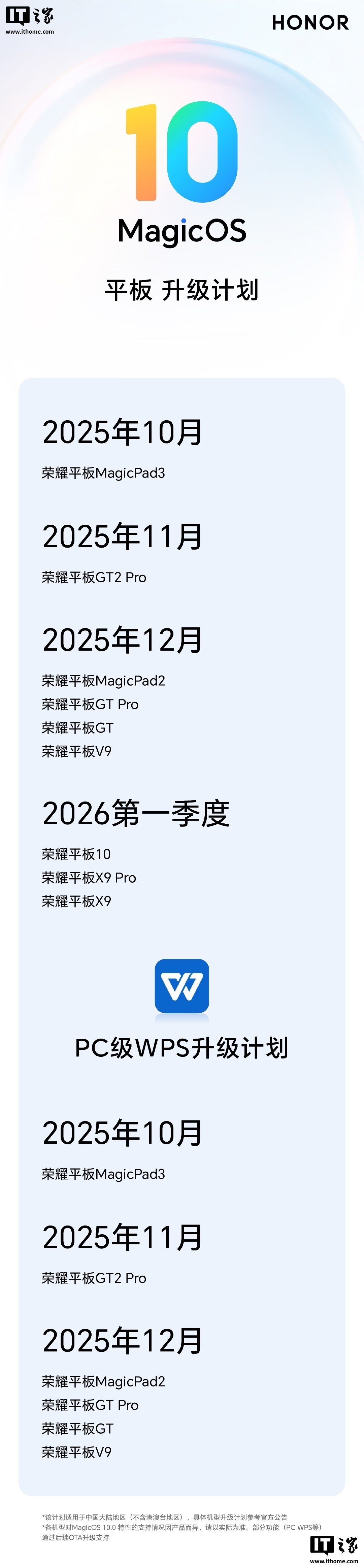 值得一提的是,荣耀终端股份有限公司平板与 IOT 产品领域总经理已在 10 月 15 日公布了荣耀平板MagicOS 10 和 PC 级 WPS 升级计划,覆盖荣耀平板 MagicPad3 / 2、荣耀平板 GT2 Pro 等。