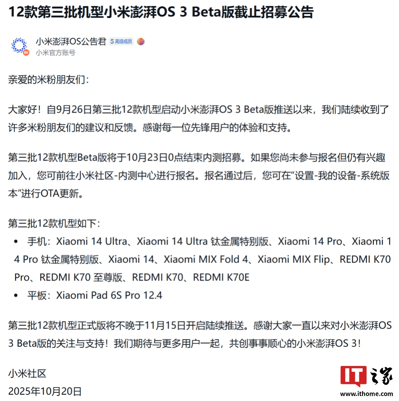 文章来源于互联网:IT之家-12 款第三批机型小米澎湃 OS 3 Beta 版截止招募,正式版不晚于 11 月 15 日陆续推送