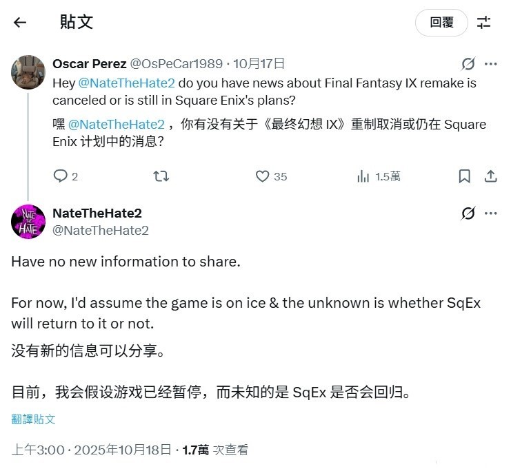 一位网友首先在 10 月 17 日向他提问:“你是否知道《最终幻想 9:重制版》是否已经被取消?”,他则回应道:“我目前没有新消息可以分享,目前我会假设游戏开发已经陷入搁置状态,而且并不明确 SE 是否会重新捡起这个项目”。