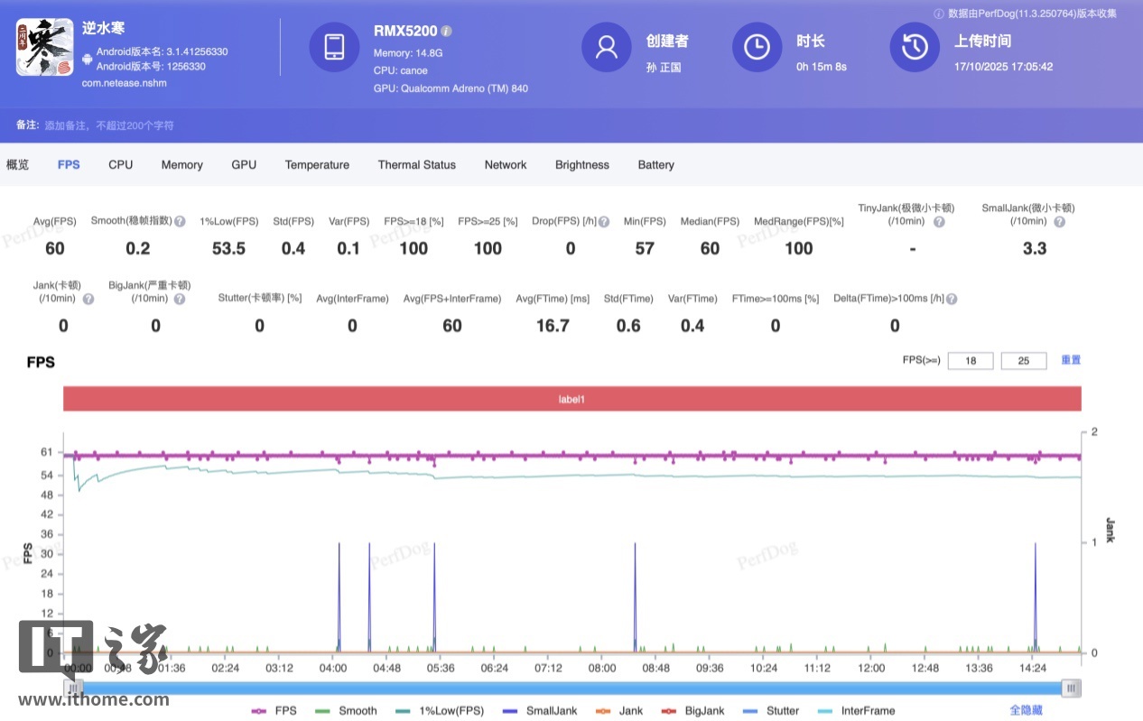 具体到游戏环节,IT之家使用 PerfDog 性能狗进行实测。《逆水寒》开启最高画质的重载负载下,帧率仍能稳定逼近满帧,1% Low 54 帧;整机平均功耗不到 4W,机身表面温度在 38.2℃ 左右,15 分钟耗电 5%,性能释放与散热控制得平衡做得很到位。