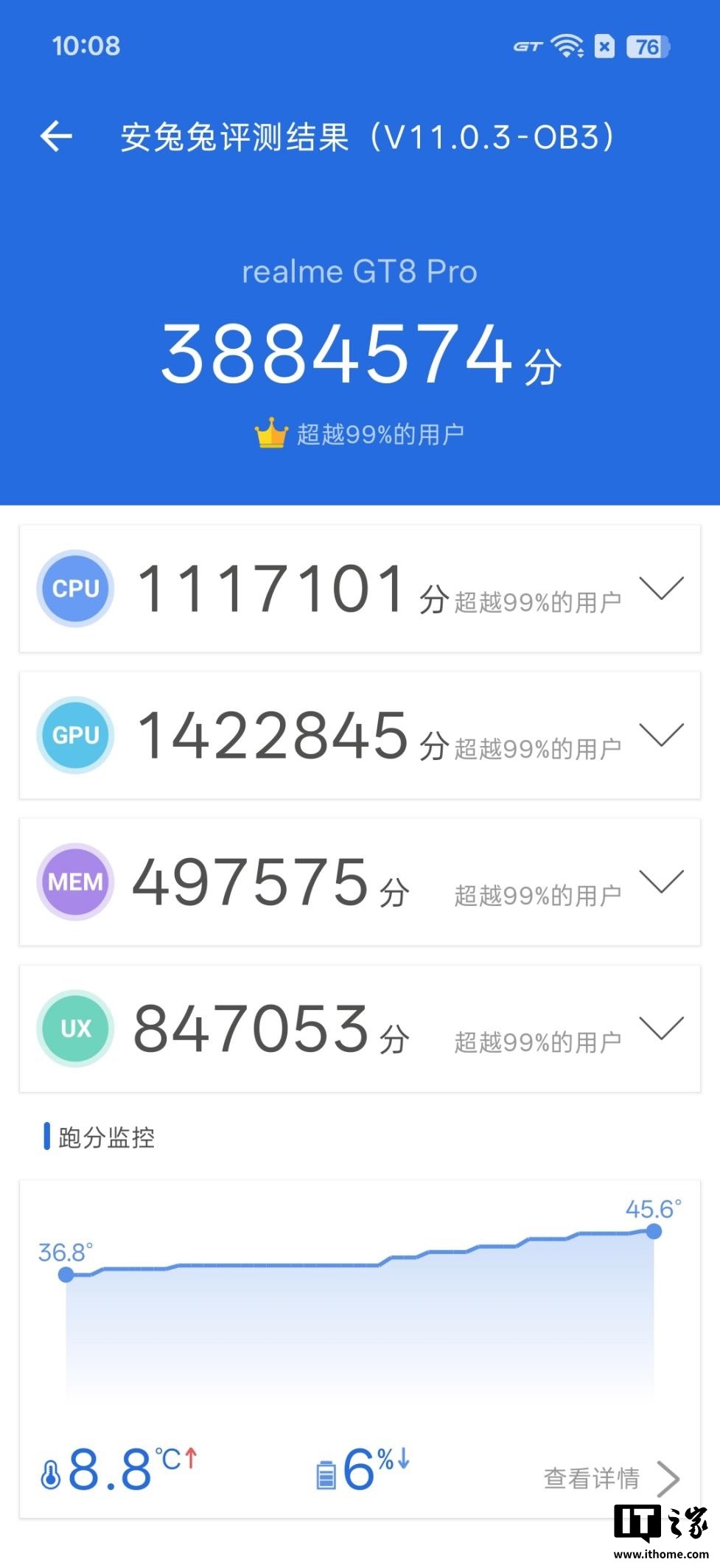 IT之家分别使用安兔兔评测、GeekBench 6、3DMark 在 GT 模式下对其性能进行测试,首先,安兔兔评测 V11.0.3 的总分达到了 3884574 分,其中 CPU 得分 1117101 分,GPU 得分为 1422845 分。