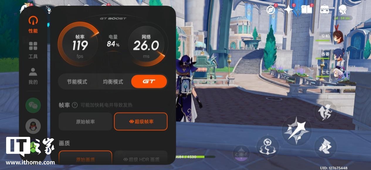 电竞独立显示芯片 R1 则支持超分超帧等技术,通过双芯并线渲染技术与骁龙的 GPU 协同工作,可以极大地提升帧率和画质表现,发挥 2K 144Hz 屏幕优势。以最高画质的原神为例,原本最高帧率上限为 60FPS,开启超级帧率后,通过 R1 芯片的插帧可轻松达到 120FPS,操作更为丝滑流畅。