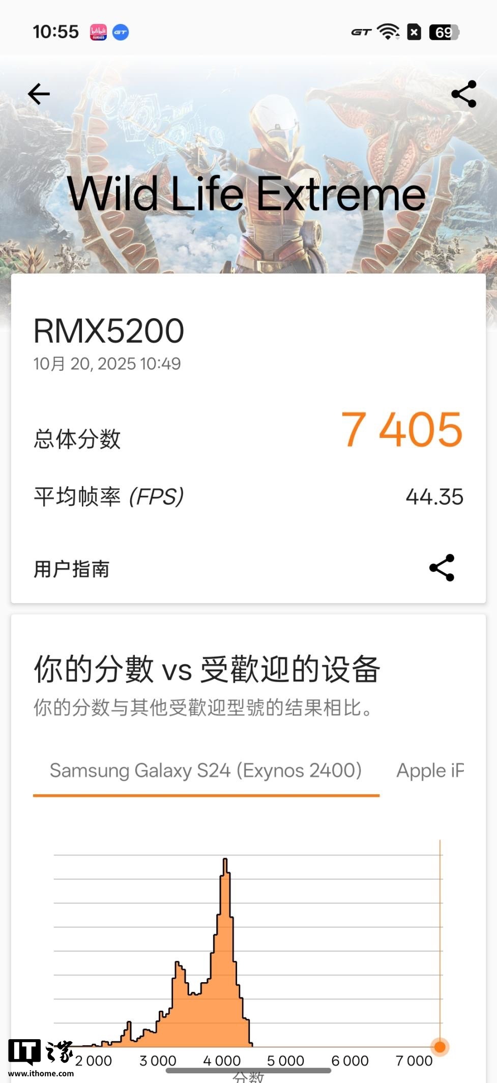 在 3DMark Wild Life Extreme 测试中,其获得了 7405 分,平均帧率 44.35 帧。