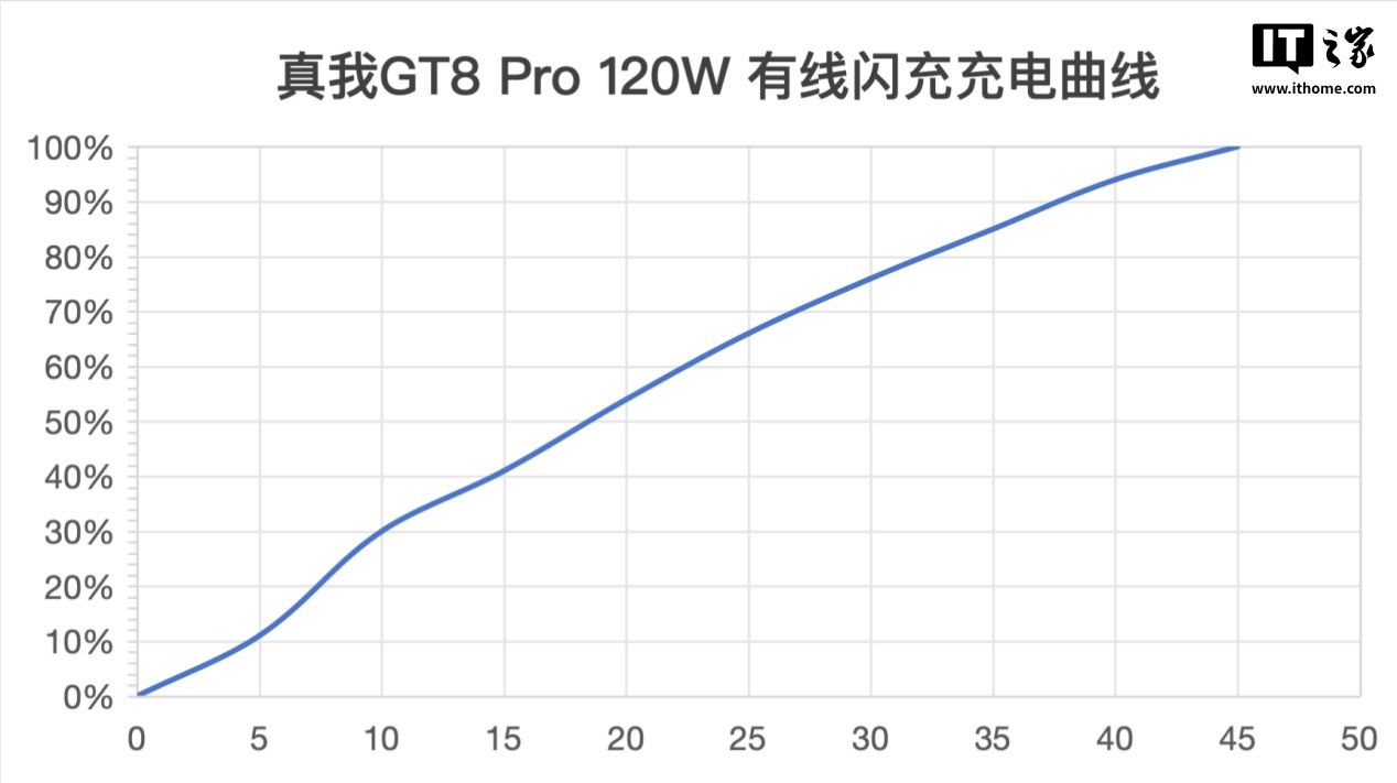 充电方面,真我 GT8 Pro 支持 120W 的超级闪充以及 50W 的无线闪充。IT之家也对真我 GT8 Pro 做了充电测试,充电时手机初始电量为 0% 关机状态,使用标配的 120W SuperVOOC 充电器,10 分钟可充到 30% 的电量,充满需要 45 分钟。另外,真我 GT8 Pro 支持旁路充电,游戏党边充边玩能有效减少发热。