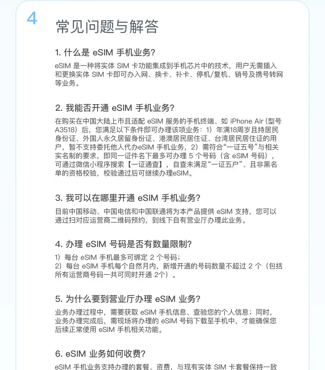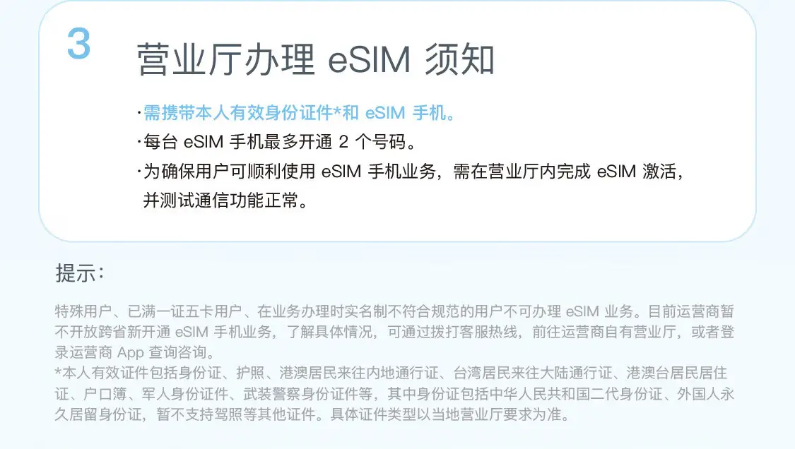 但需要指出的是,在商用试验期间暂不开放线上方式办理 eSIM 手机业务,用户可持 eSIM 手机及有效身份证件原件到运营商线下营业厅门店办理开通 eSIM 手机业务。
