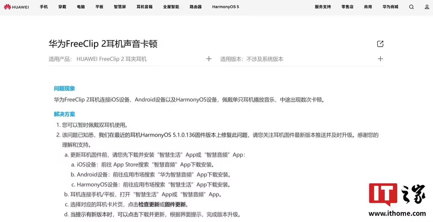 华为官网显示,华为 FreeClip 2 耳机此前连接 iOS 设备、Android 设备以及 HarmonyOS 设备,佩戴单只耳机播放音乐,中途出现数次卡顿,该问题已在最新版本(HarmonyOS 5.1.0.136)修复。