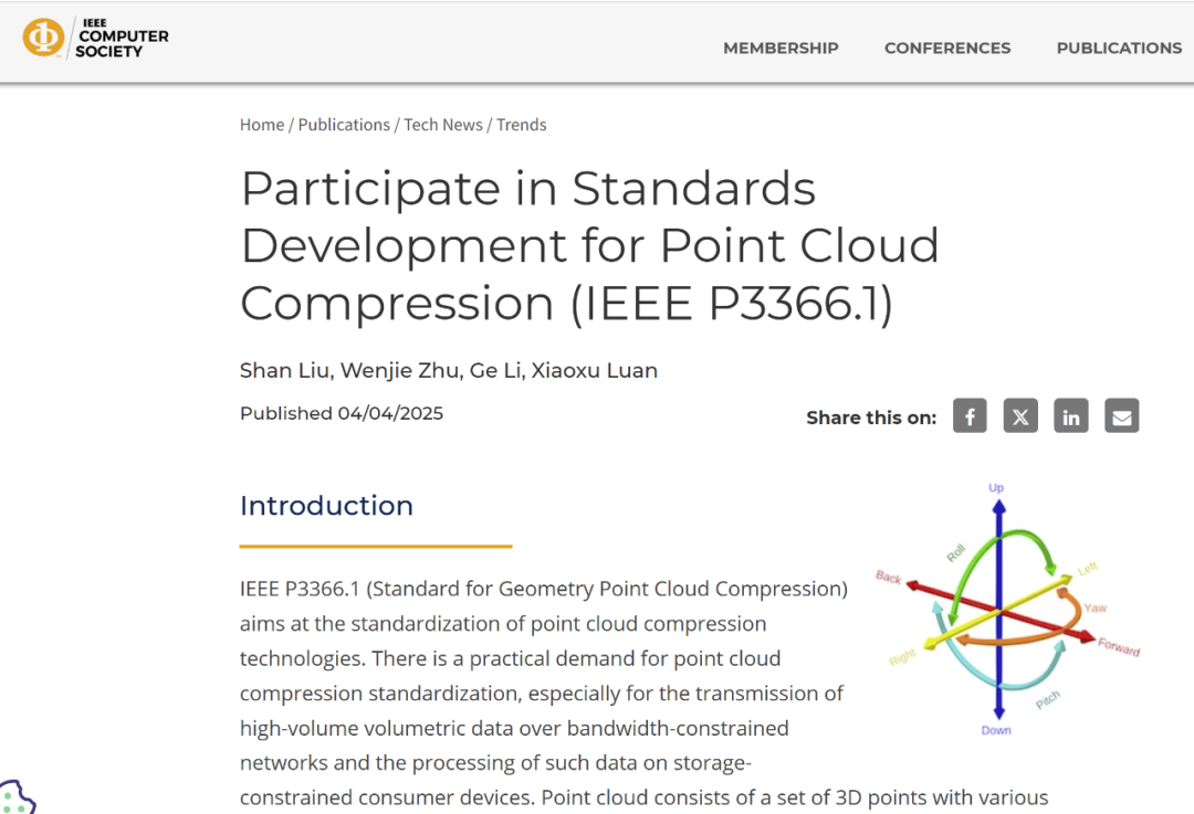 IT之家 10 月 22 日消息,IEEE 官网于 10 月 16 日发布博文,正式发布了 P3366.1 点云压缩国际标准,这是其是面向体积数据压缩的 IEEE 3366 系列国际标准的第一个完成标准。该标准由腾讯多媒体实验室作为主要牵头方和核心技术贡献者,历时四年完成制定。