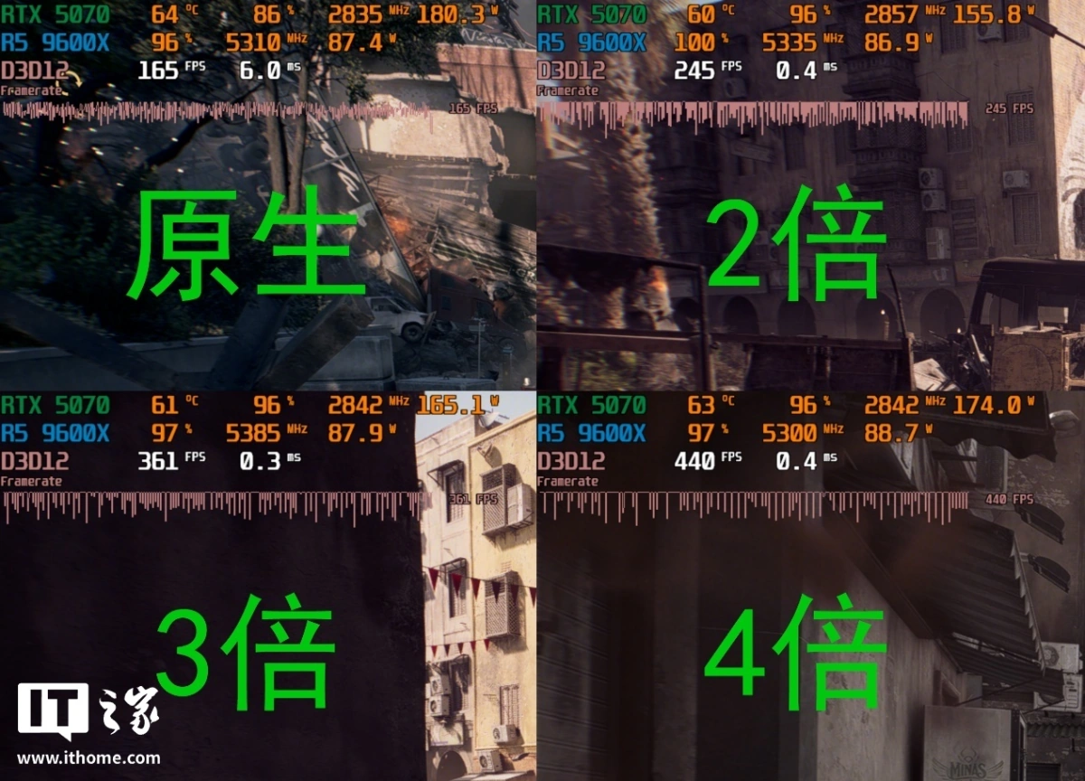 最后是压力相对最小的 1080P 分辨率,也是追求极致性能和帧数的玩家最常用的分辨率。此时原生画质下,游戏帧数进一步增加到 165 帧,而开启 DLSS 4 多帧生成后最多可提升 2.6 倍的帧数,暴涨到 440 帧。如果进一步将 DLSS 等级改为平衡或者性能,帧数仍有一定的上升空间。