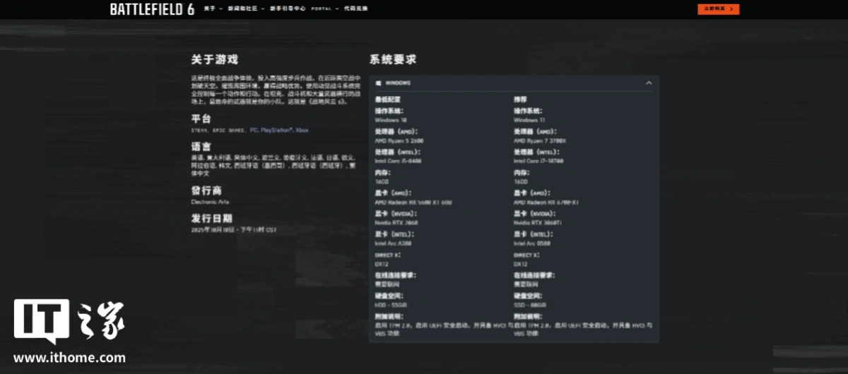 《战地风云 6》的硬件要求门槛一点不低,官方给出的 2K 60 帧 Ultra 设置的极致配置建议,就得有锐龙 7 7800X3D / 酷睿 i9-12900K 处理器以及 RTX 4080 / RX 7900 XTX 显卡支持,游戏对于 CPU 和 GPU 的压力可见一斑。