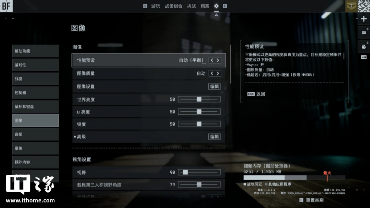进入游戏设置菜单,游戏给到的默认性能预设为「自动(平衡)」,图像质量也是「自动」,新手用户完全可以不设置图像选项,熟悉和调整键位、可视化选项后立即体验游戏,这点也比较人性化。