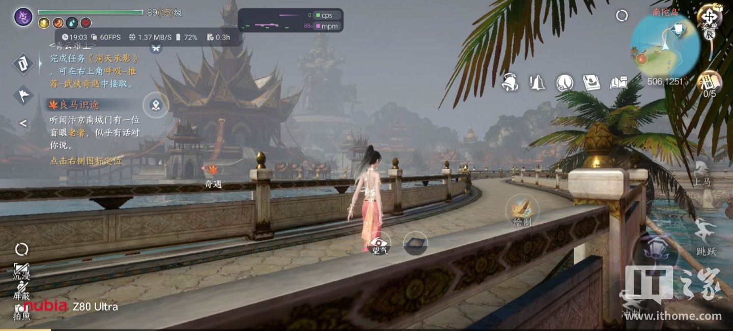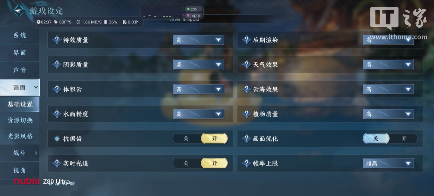 这里以《逆水寒》手游为例,选择非常考验性能的南陀岛地图,这里的画质选择最高全开,包括开启实时光追,帧率选择超高。
