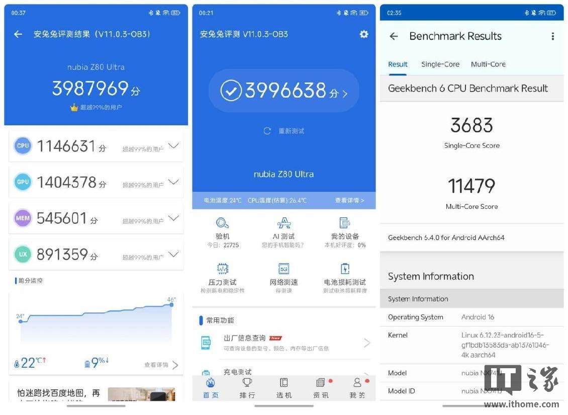 IT之家首先对努比亚 Z80 Ultra 进行了安兔兔 V11 的综合跑分测试,其跑分成绩达到 3996638 分,其中 CPU 达到了 114 万 +、GPU 达到了 140 万 + 的分数;再看 GeekBench 6 的 CPU 跑分,单核 3683 分,多核成绩达到 11479 分。