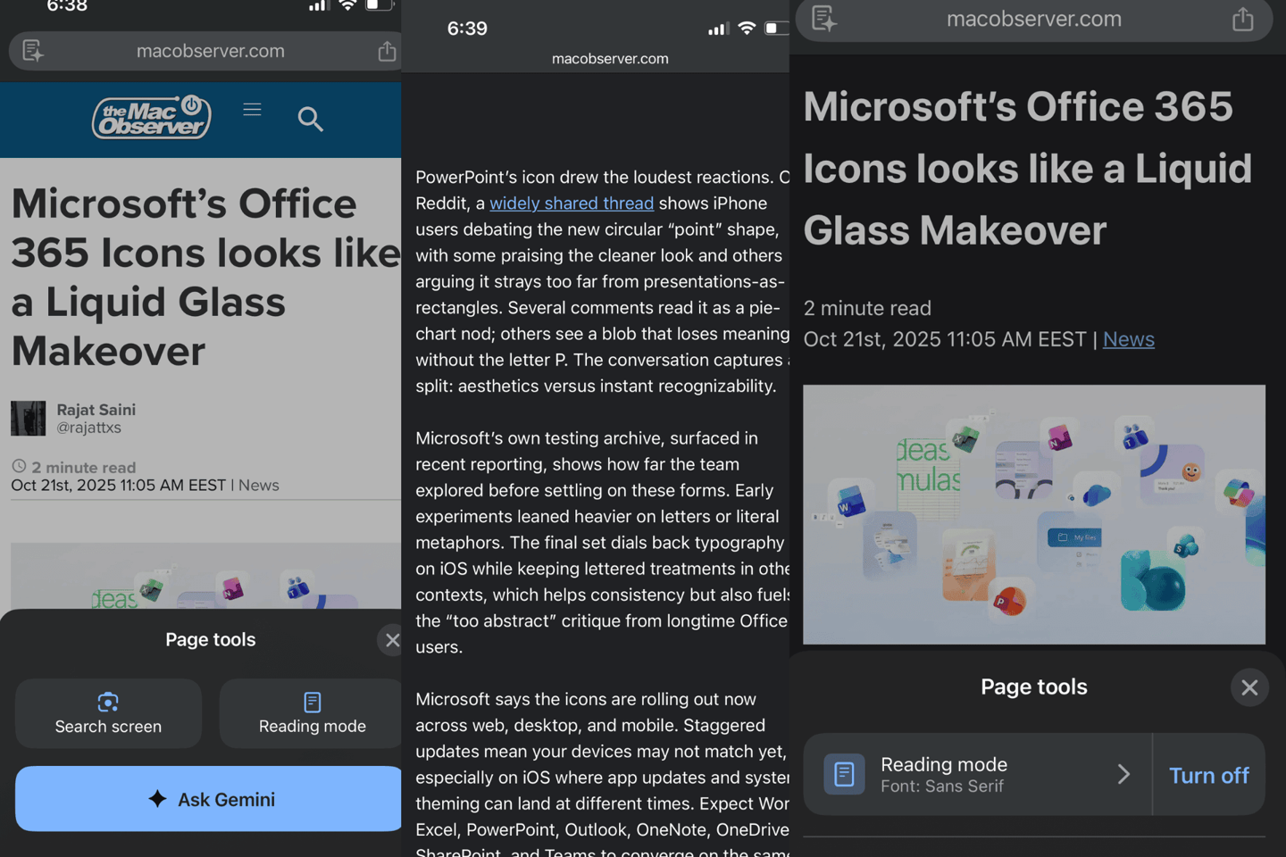 IT之家在此援引 MacObserver 表述,这项功能现在位于“页面工具”菜单内,启用时会有一段过渡动画,将网页轻轻融入深色背景,随后呈现出一份聚焦于文章主题的清晰页面,默认使用无衬线字体,使文章更加干净、易读,关闭阅读模式时,系统会通过反向动画过渡回原始网页,整体看起来比较精致。