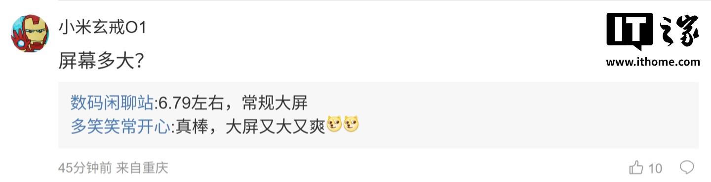 ”;另一名用户则询问道:“屏幕多大?”,博主则回复道:“6.79 左右,常规大屏”。