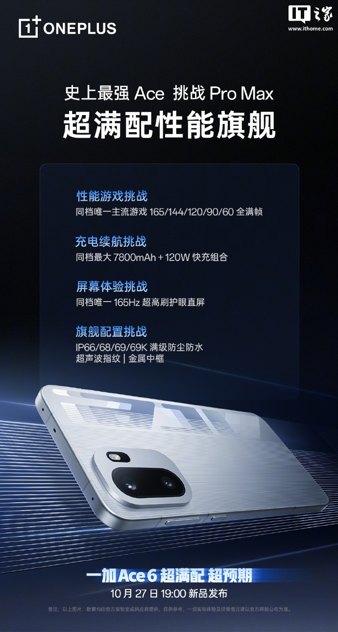 IT之家 10 月 23 日消息,一加官方今天在微博发布预热,宣称 Ace 6 手机将搭载同挡位唯一 165Hz 超高刷护眼直屏,10 月 27 日晚 19 点正式发布。