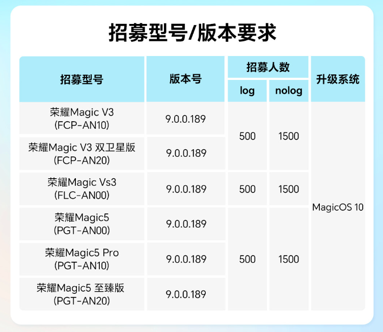 IT之家 10 月 23 日消息,荣耀今日发布MagicOS 10 内测第三批机型用户招募公告,涵盖了 Magic5 / V3 系列手机,版本号要求为 9.0.0.189。