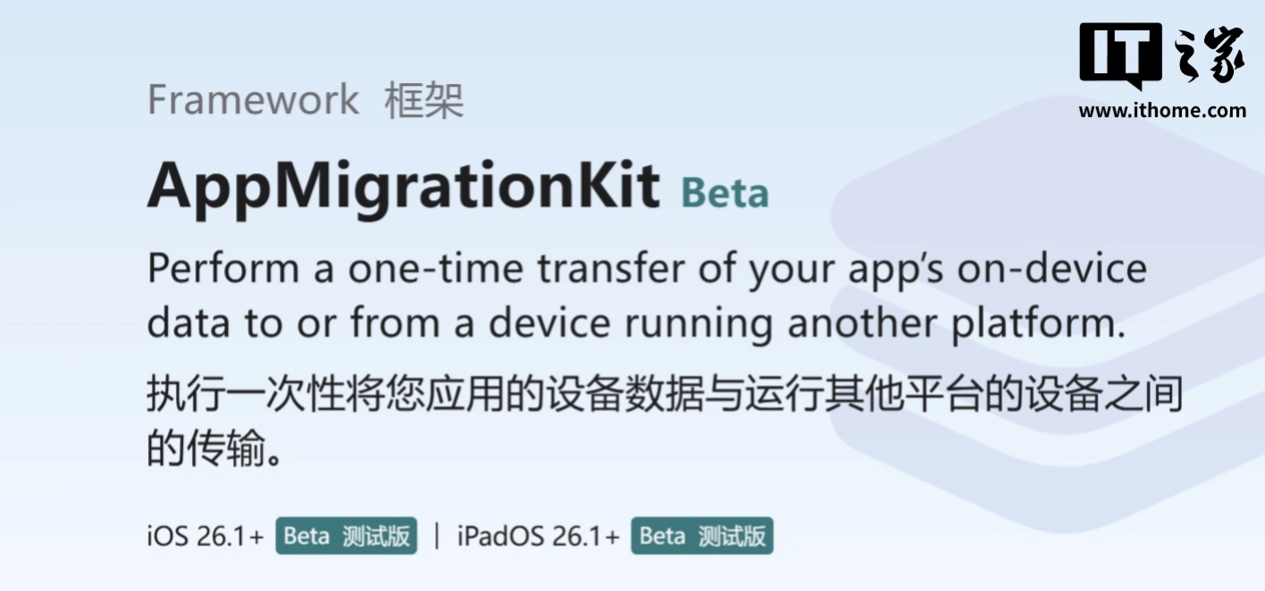 值得注意的是,苹果官方特别强调,AppMigrationKit 仅支持与安卓等非苹果平台之间的数据迁移,而不能用于苹果设备之间(例如从 iPhone 到 iPad)的数据转移。此外,该框架在 visionOS 或苹果芯片 Mac 上运行的 iOS 应用中也无法生效。