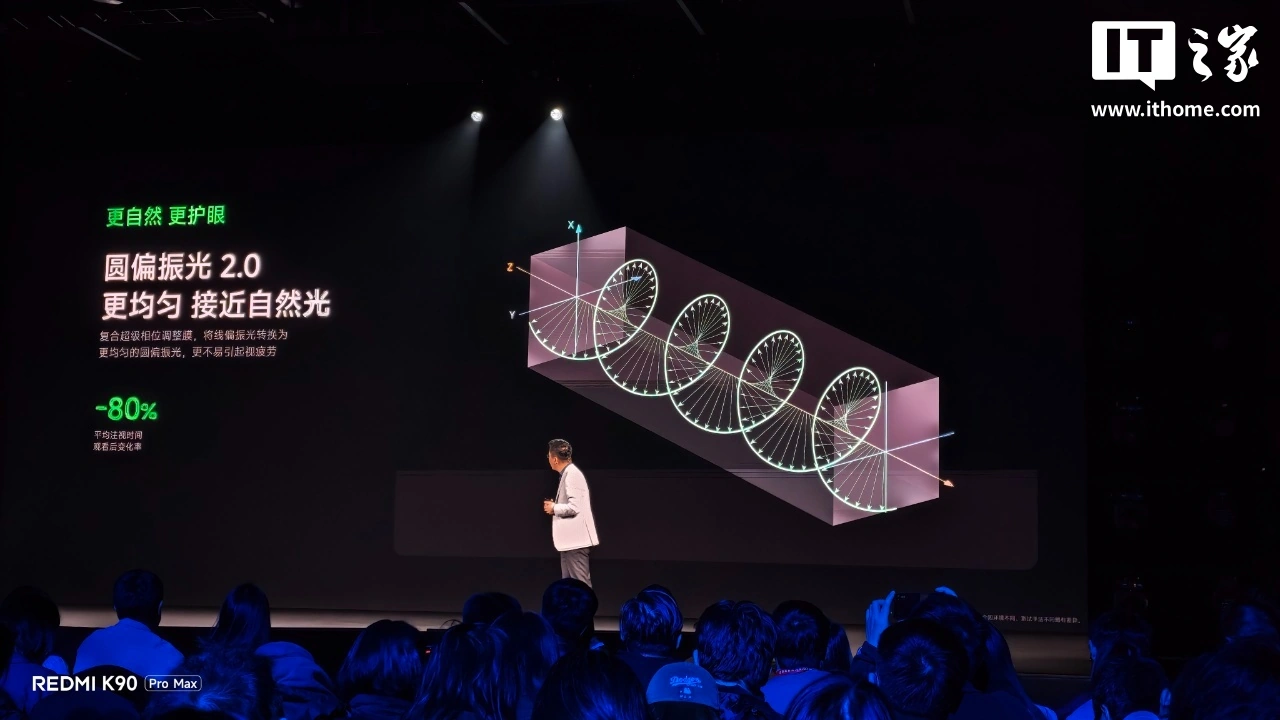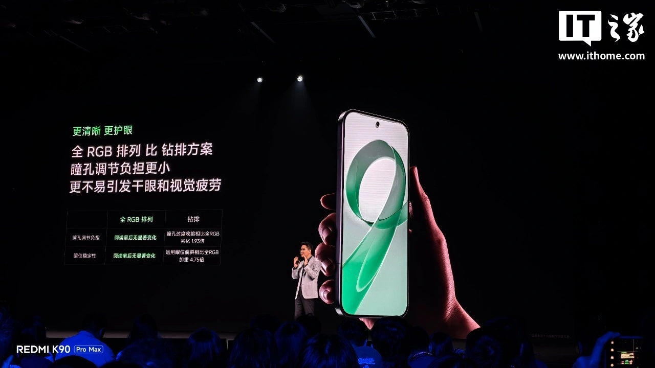 REDMI K90 Pro Max 配备 6.9 英寸超级像素全 RGB 排列屏幕,采用 M10 新一代屏幕发光材料 + 新型红色发光主材,支持圆偏振光 2.0 护眼 + 全亮度 DC 调光 + 暗光护眼 + 1nit 超低亮度护眼。新机还配备小米龙晶玻璃,支持 3D 超声波指纹。