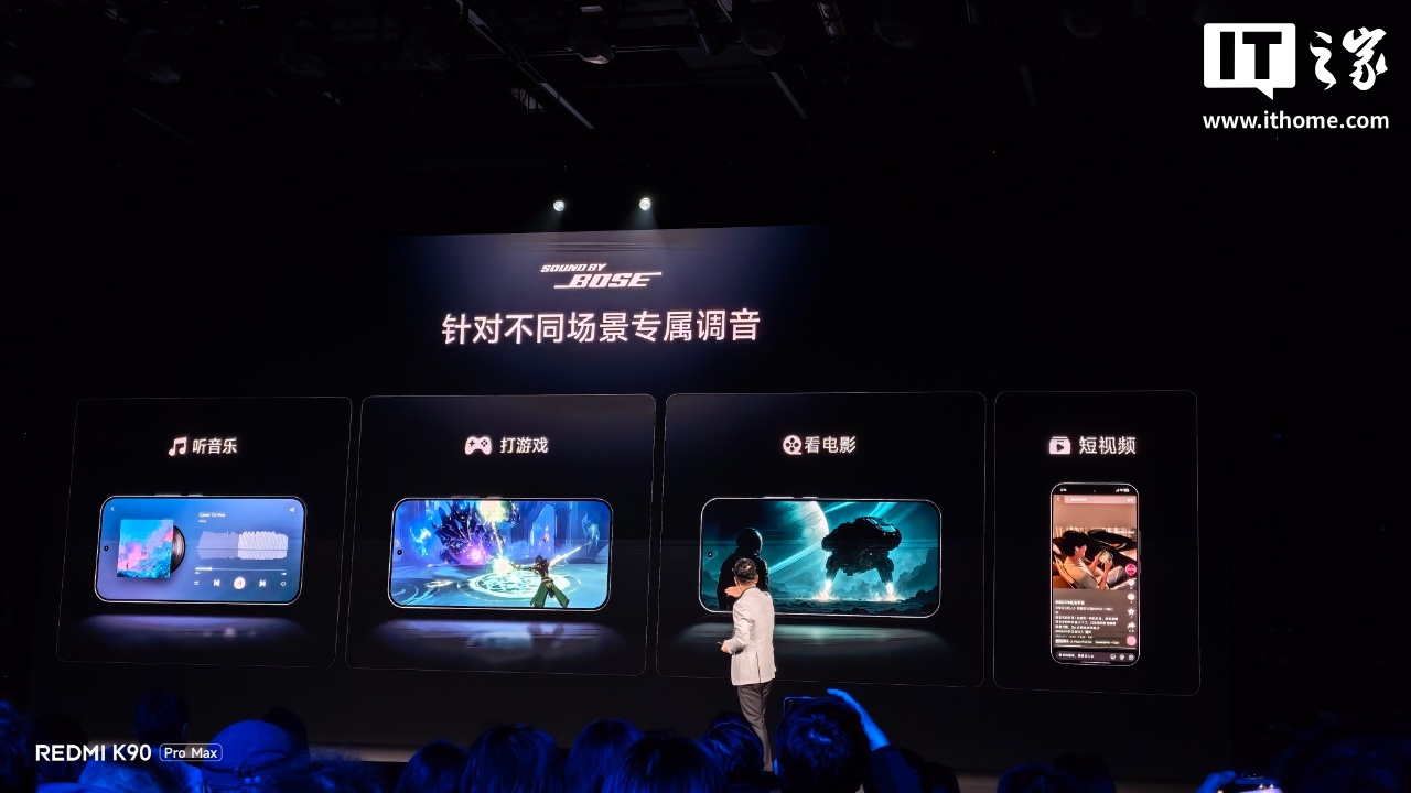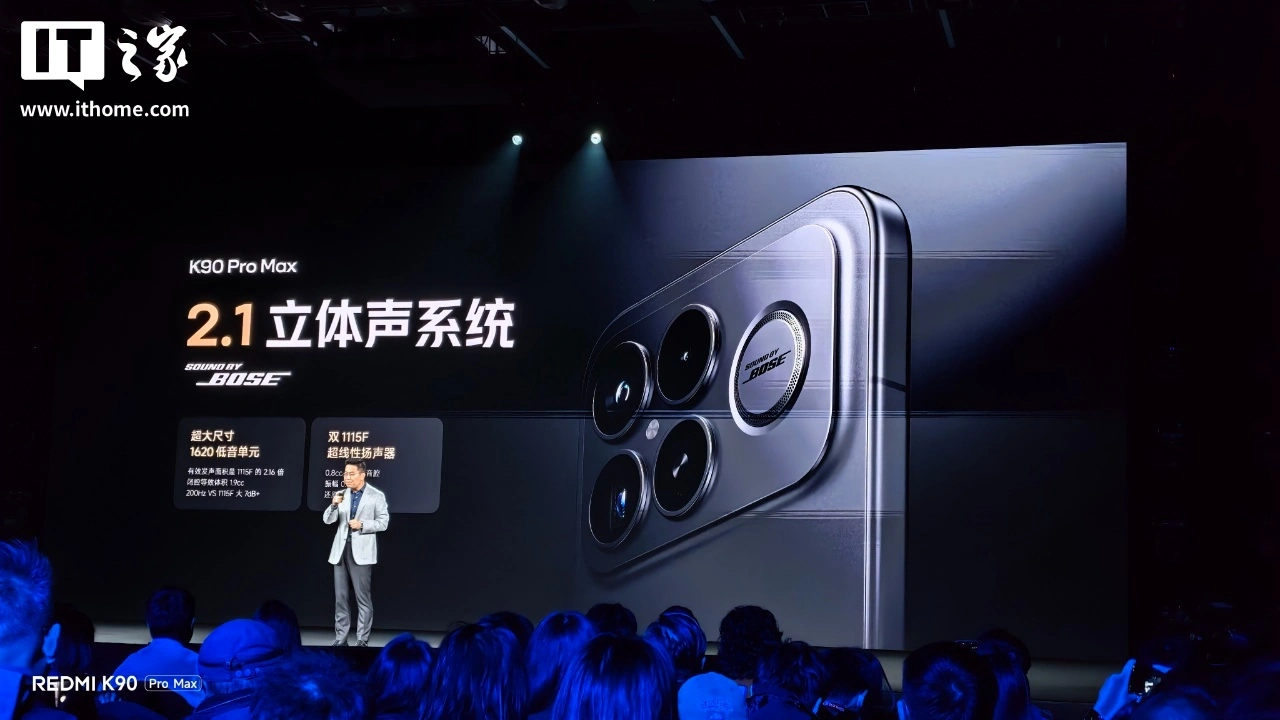 REDMI K90 Pro Max 搭载 2.1 立体声系统,配备两颗超线性扬声器 + 超大尺寸低音单元,采用 Sound by Bose 联合调音,号称“移动声学时代”。