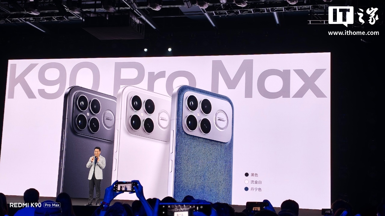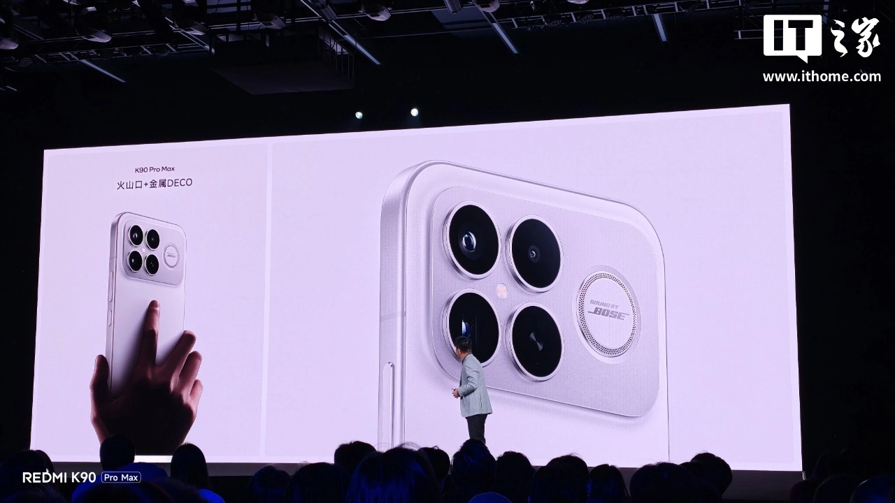 据介绍,小米 REDMI K90 Pro Max 采用火山口 + 金属 DECO 设计、配备四曲包裹式金属中框 + 背部扬声器镭雕微孔,提供流金白、黑色、丹宁色三种配色和冠军版可选。