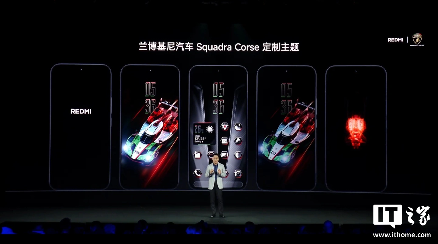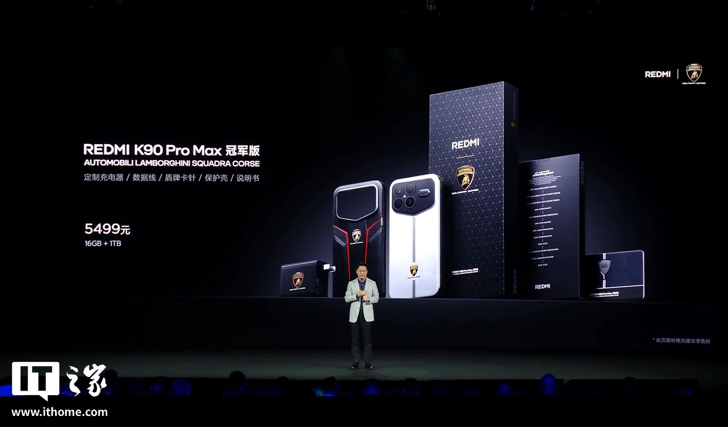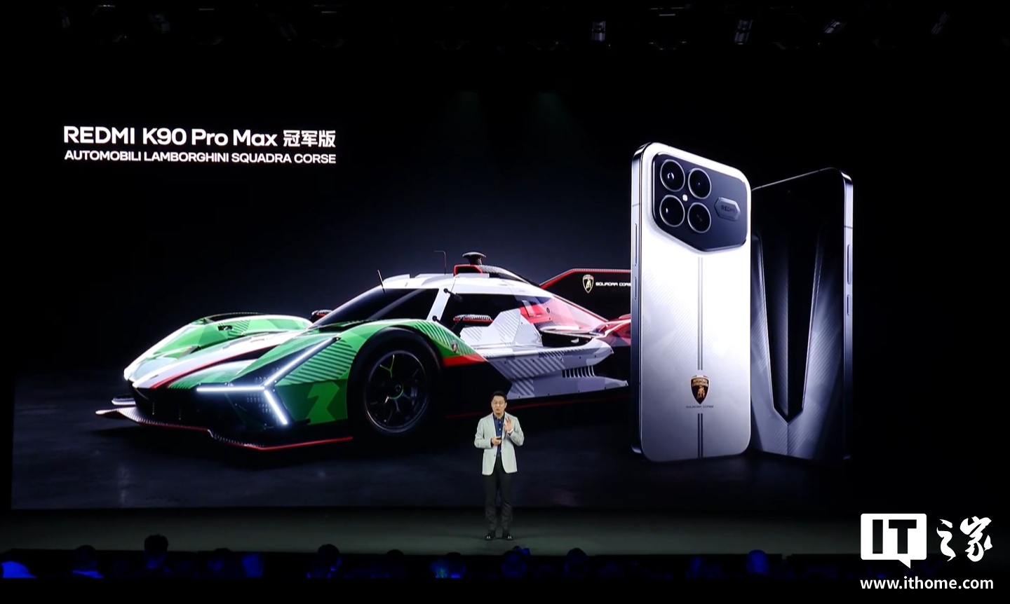 IT之家 10 月 23 日消息,在今晚的 REDMI K90 系列新品发布会上,小米 REDMI K90 Pro Max 冠军版手机正式发布。新机基于 REDMI K90 Pro Max 16GB+1TB 规格版本打造,拥有兰博基尼 SQUADRA CORSE 定制外观 / 主题设计,定价 5499 元