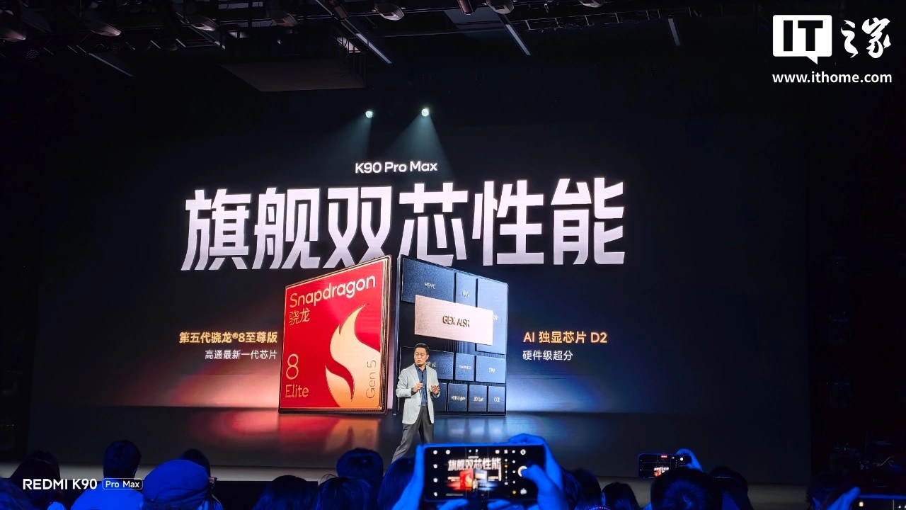 小米 REDMI K90 Pro Max 手机搭载第五代骁龙 8 至尊版高通年度旗舰芯 + 全新 AI 独显芯片 D2,狂暴引擎升级前端侦测 + 一体化动态调频,可精准控制 CPU、GPU 余量,实现帧挽救。