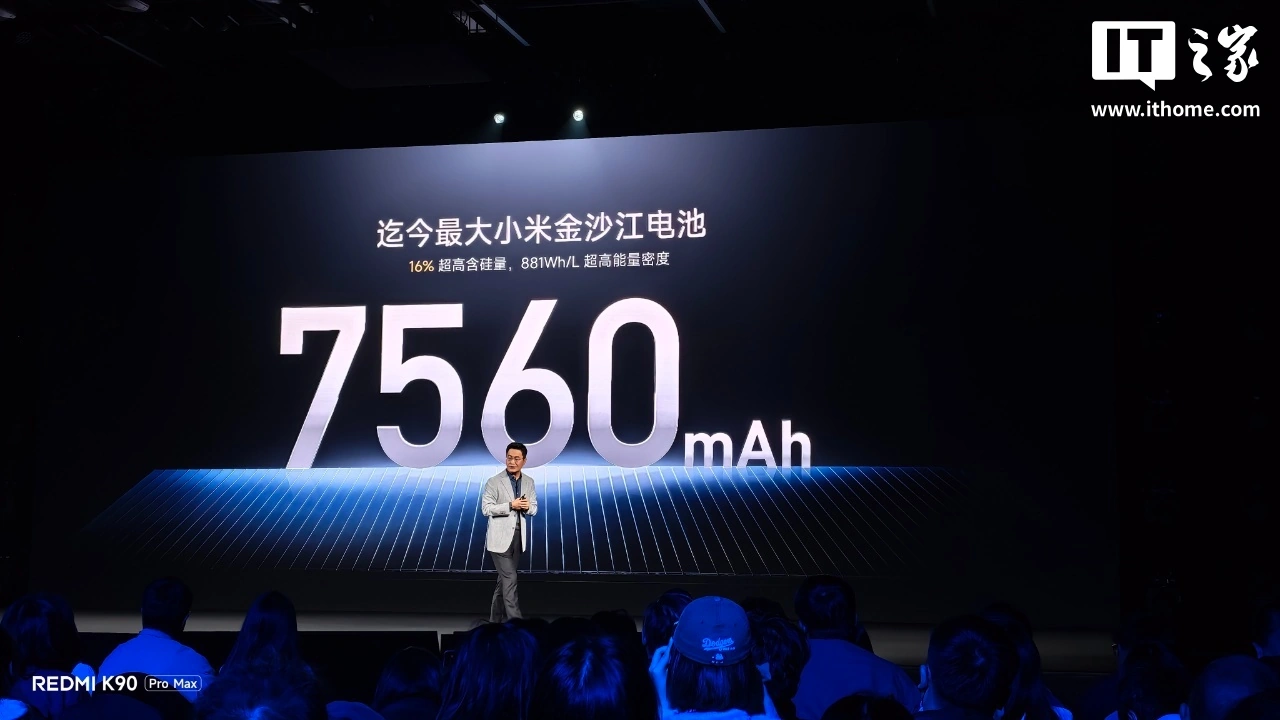 REDMI K90 Pro Max 手机还配备 7560mAh 迄今最大小米金沙江电池,拥有 16% 高含硅量 + 881Wh / L 能量密度,支持 100W 有线秒充 + 50W 无线秒充 + 22.5W 有线 / 无线反充 + 旁路充电 + 100PPS 快充。